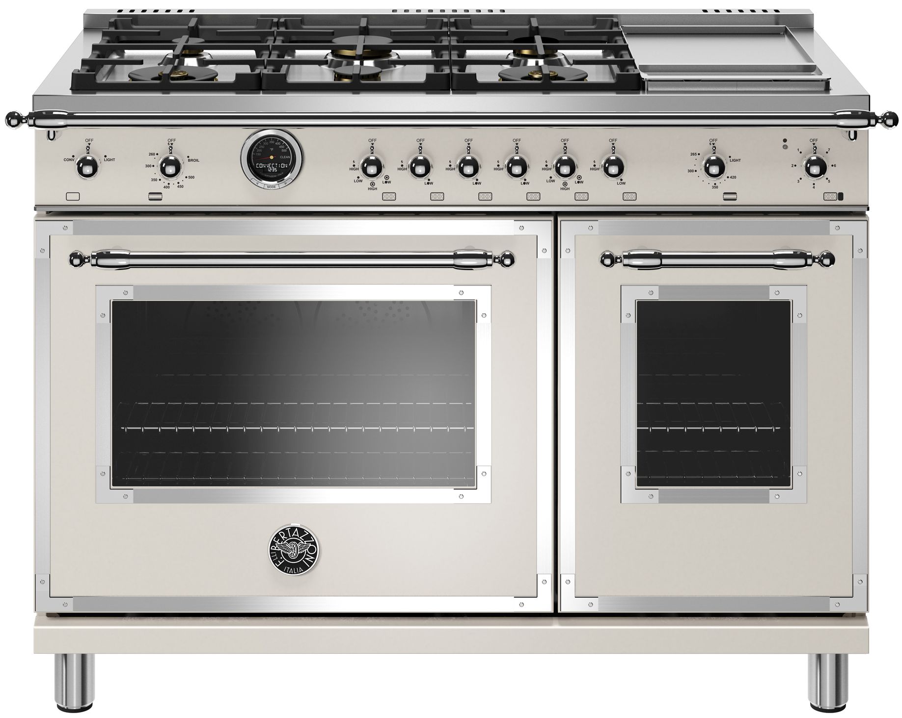 The new Bertazzoni ranges are superb cooking appliances designed, engineered and made in Italy. All Bertazzoni appliances integrate seamlessly into style-harmonized suites for a true, high-performing kitchen. The high-efficiency maintop with 6 brass burners and electric griddle features 2 dual ring 19,000 BTU power-burners that boil water in under 6 minutes (best in class), and 4 additional MonoBloc burners of variable size and power to suit every style of cooking, with delicate simmer at 750 BTUs. The stainless steel griddle with integrated cover provides additional cooking options. The 4.6 cubic feet self-cleaning oven is the largest in its class, with dual convection fan for balanced airflow and even temperature baking and roasting on 7 shelf levels. The elegant digital temperature gauge monitors the actual temperature in the oven and has integrated controls in the bezel for the food temperature probe. The extra wide electric broiler with optional convection is ideal for grilling and searing at high heat. The 2.4 cubic feet auxiliary oven is perfect for smaller dishes and for warming. Both ovens include convenient features such as smooth telescopic glides for the oven shelves and soft-close doors. The edge-to-edge interior oven glass door maximizes interior volume and can be wiped clean without effort. All Bertazzoni appliances are covered by a 2-year warranty. Products and packaging are 99% recyclable.