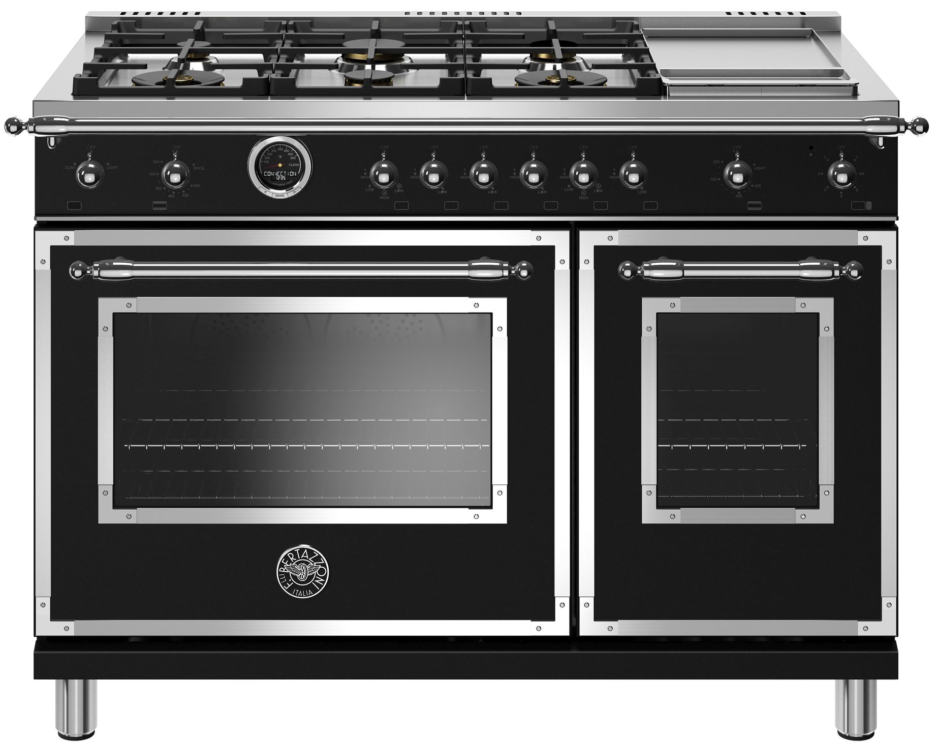 The new Bertazzoni ranges are superb cooking appliances designed, engineered and made in Italy. All Bertazzoni appliances integrate seamlessly into style-harmonized suites for a true, high-performing kitchen. The high-efficiency maintop with 6 brass burners and electric griddle features 2 dual ring 19,000 BTU power-burners that boil water in under 6 minutes (best in class), and 4 additional MonoBloc burners of variable size and power to suit every style of cooking, with delicate simmer at 750 BTUs. The stainless steel griddle with integrated cover provides additional cooking options. The 4.6 cubic feet self-cleaning oven is the largest in its class, with dual convection fan for balanced airflow and even temperature baking and roasting on 7 shelf levels. The elegant digital temperature gauge monitors the actual temperature in the oven and has integrated controls in the bezel for the food temperature probe. The extra wide electric broiler with optional convection is ideal for grilling and searing at high heat. The 2.4 cubic feet auxiliary oven is perfect for smaller dishes and for warming. Both ovens include convenient features such as smooth telescopic glides for the oven shelves and soft-close doors. The edge-to-edge interior oven glass door maximizes interior volume and can be wiped clean without effort. All Bertazzoni appliances are covered by a 2-year warranty. Products and packaging are 99% recyclable.